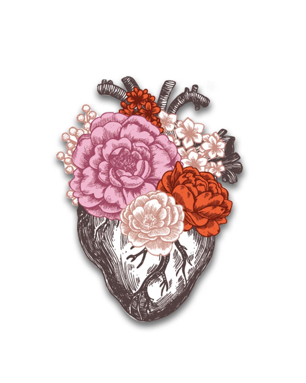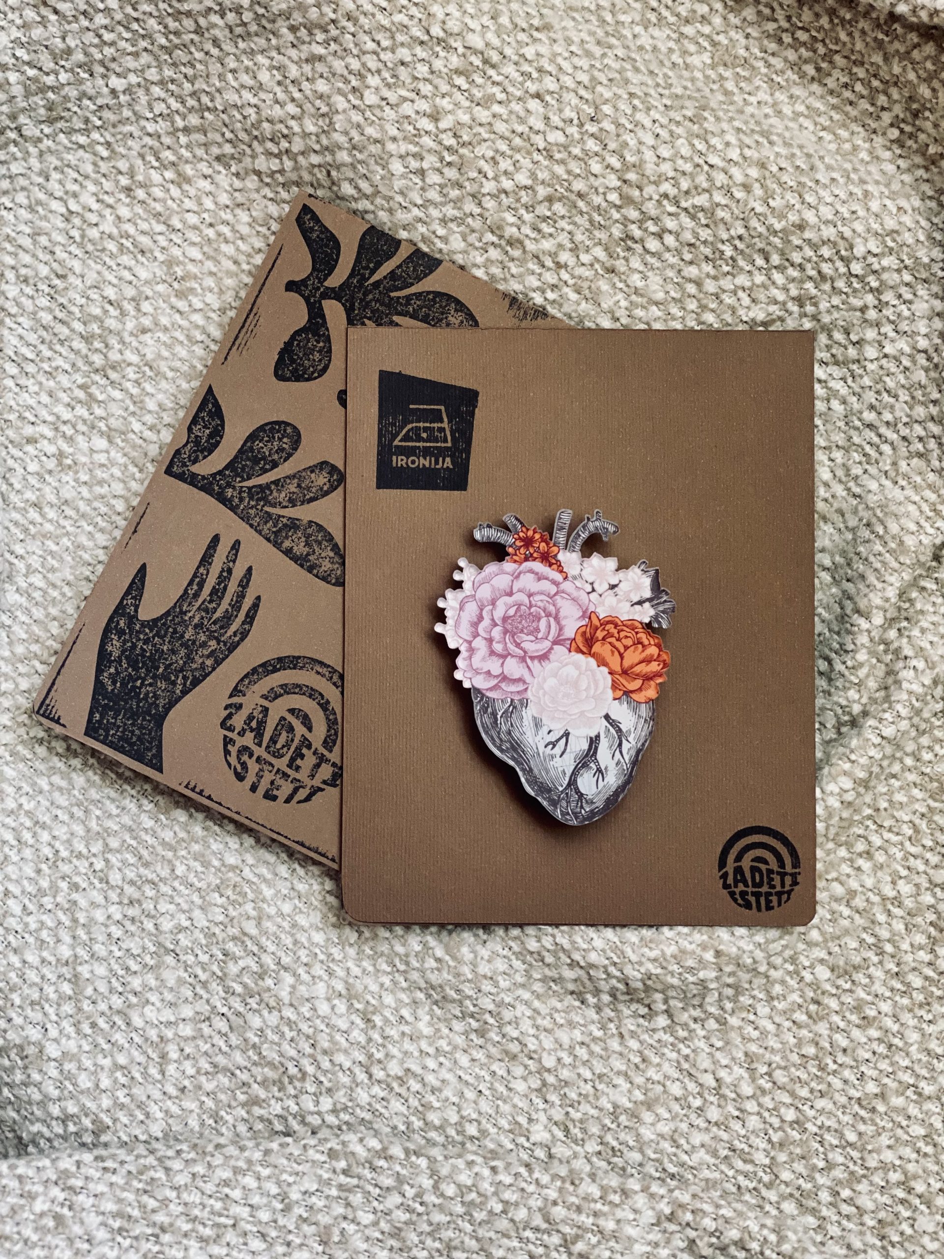 CVETOČE SRCE, broška iz pleksi stekla s potiskom. Velikost broške: 7,5 cm x 5,5 cm.