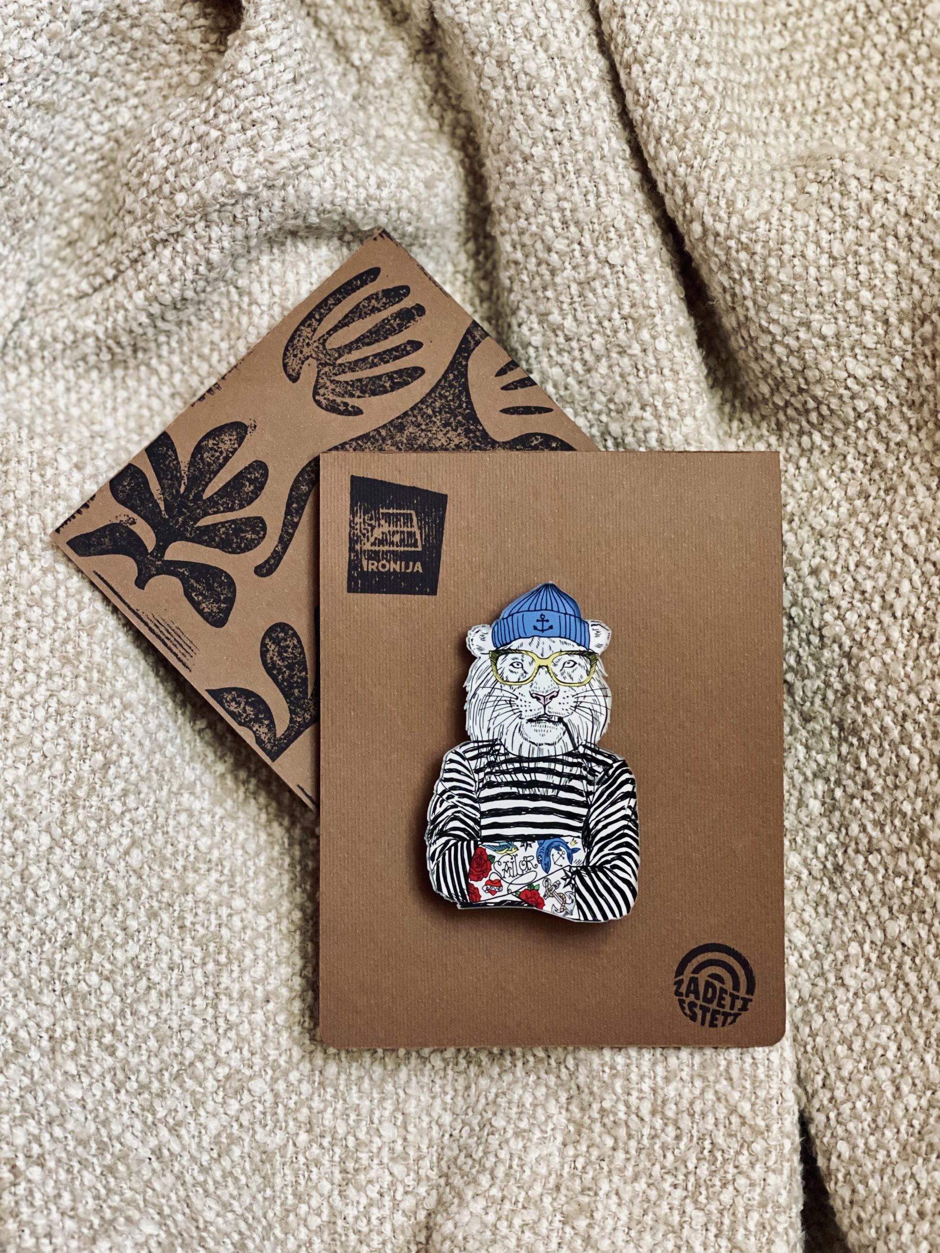 ODKAČEN IN LAČEN, broška iz pleksi stekla s potiskom.