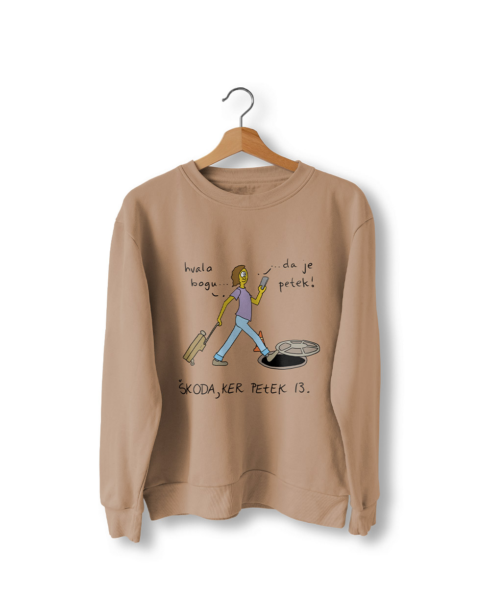 Potiskan, topel pulover z dolgimi rokavi in okroglim izrezom. Znotraj kosmaten. Patent na rokavih in okoli pasu.
